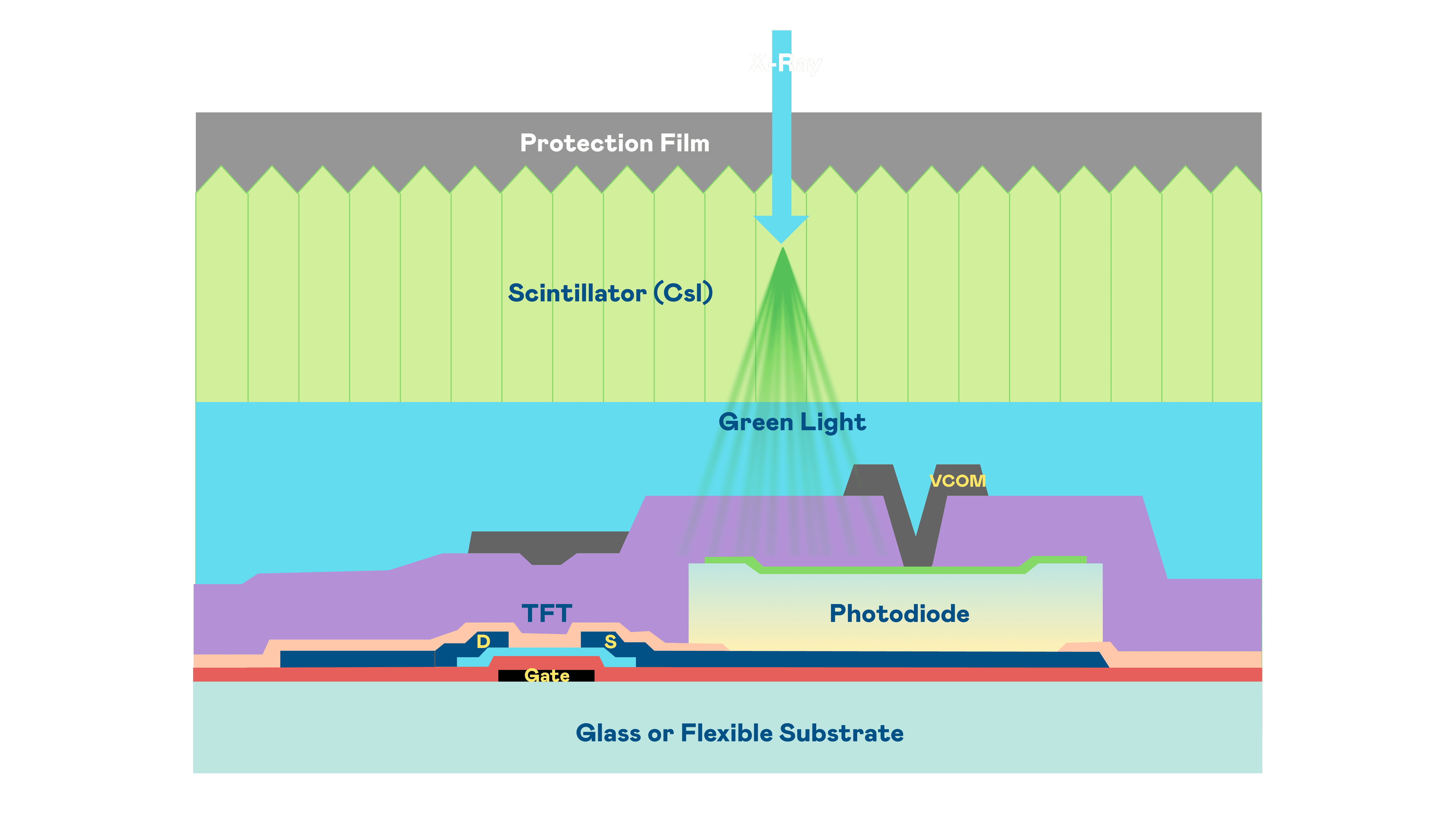 尊龙z6的X光影像感测阵列使用薄膜电晶体 (TFT) 作为每个像素的读取开关,,,,搭配光电二极体(Photodiode)的光电转换元件,,,,用以感测X光影像讯号。。。。