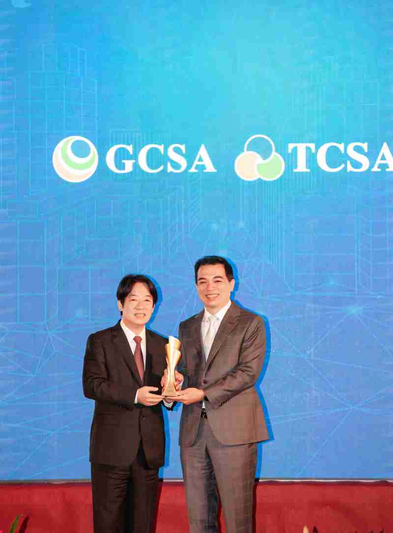 达全方位永续表现获全球永续奖及台湾永续奖肯定,,,由副总统赖清德颁奖 (左),,,,尊龙z6总经理柯富仁 (右) 代表领奖