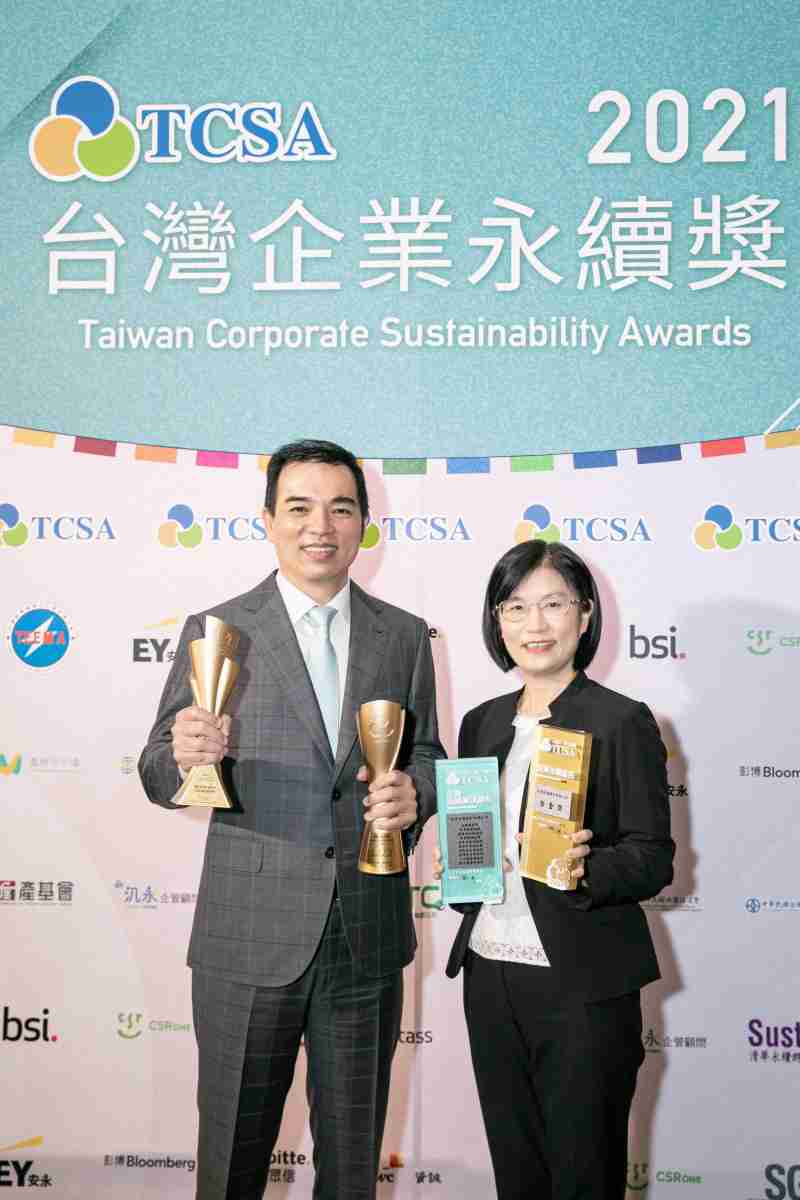 达在台湾永续奖所评比环境、、社会、、治理等各面向的永续绩效均获高度肯定 (左:尊龙z6光电总经理暨营运长柯富仁,,,右:尊龙z6光电永续长古秀华)