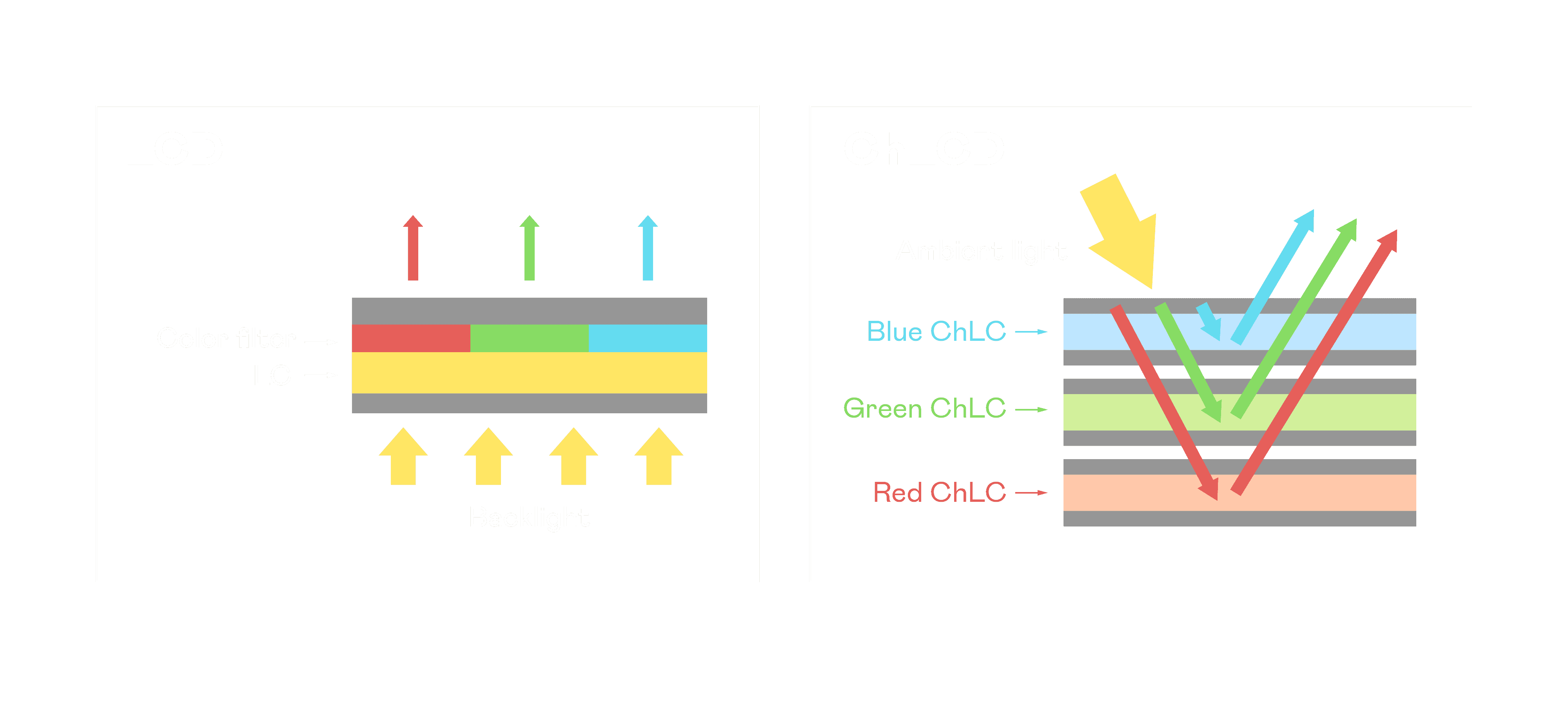 ChLCD 胆固醇液晶就如同纸张一样,,,,透过反射环境光来显示影像,,因此长时间观看不易造成人眼视觉疲劳,,,,可达到护眼效果。。当处于户外阳光下使用,,,,LCD 影像容易失真而不易观看,,,,但胆固醇液晶仍可维持较佳的影像品质。。